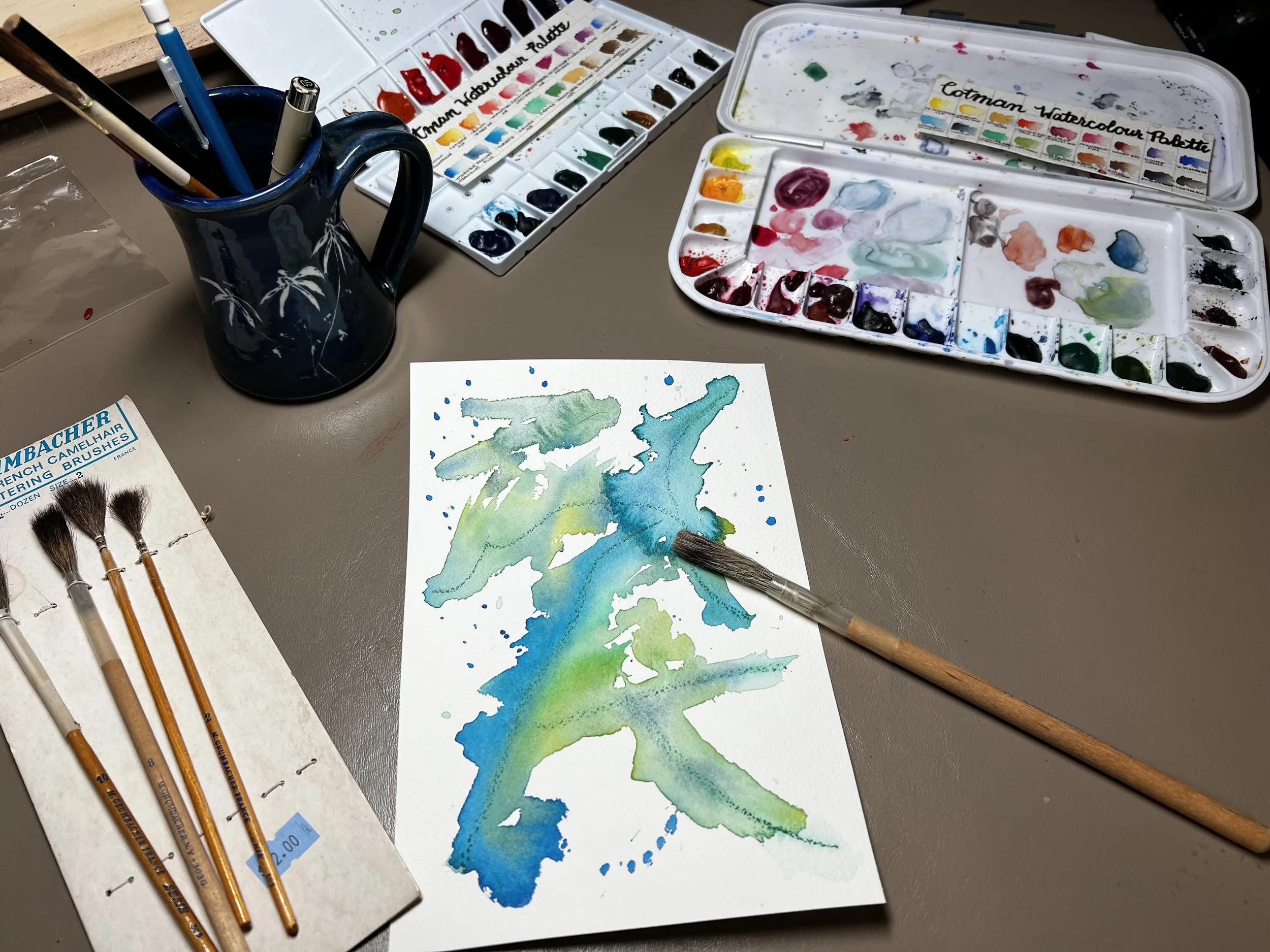 So, on days when I throw away painting after painting directly from my table into the trash because I hate them, that’s okay. It’s okay because they weren’t the point anyways. Recently I did just this. I threw away paintings of varying completion because I hated them all. Frustrated, I tried again. That next one I was about to throw away too but instead I picked up a fluffy new, vintage floofy camel hair brush (that I’ve since learned is most likely squirrel hair) that I’d just gotten at a thrift store in a pack for $2 and started splashing and flinging paint on it willy nilly, mostly annoyed. I didn’t care how it turned out anymore and I just kept watching the water and the paint and the brush and just kept on splashing and sloshing water and paint. Then I stopped, seemingly having gotten over my frustration, and looked down at my paper. It was the best painting that I’d done all day. It was crazy. I felt a bit crazy. I was almost trying to ruin the painting, I was being so sloshy. I had been about to throw it away and then I let go instead. I expressed myself and let go of having to have it look a certain way, and it turned out that I loved it. This seemed to be a change that day for me. Feeling like I could just paint and not worry, I picked up the floofy brush again and a green watercolor crayon that my 9-year-old daughter got in a mixed bag of random art supplies at the same thrift store and painted. At the last few brush flings of paint, I actually laughed out loud in joy. I enjoyed the process so much and I loved the bright blue and green colors that I chose. That’s what matters, not the resulting painting.